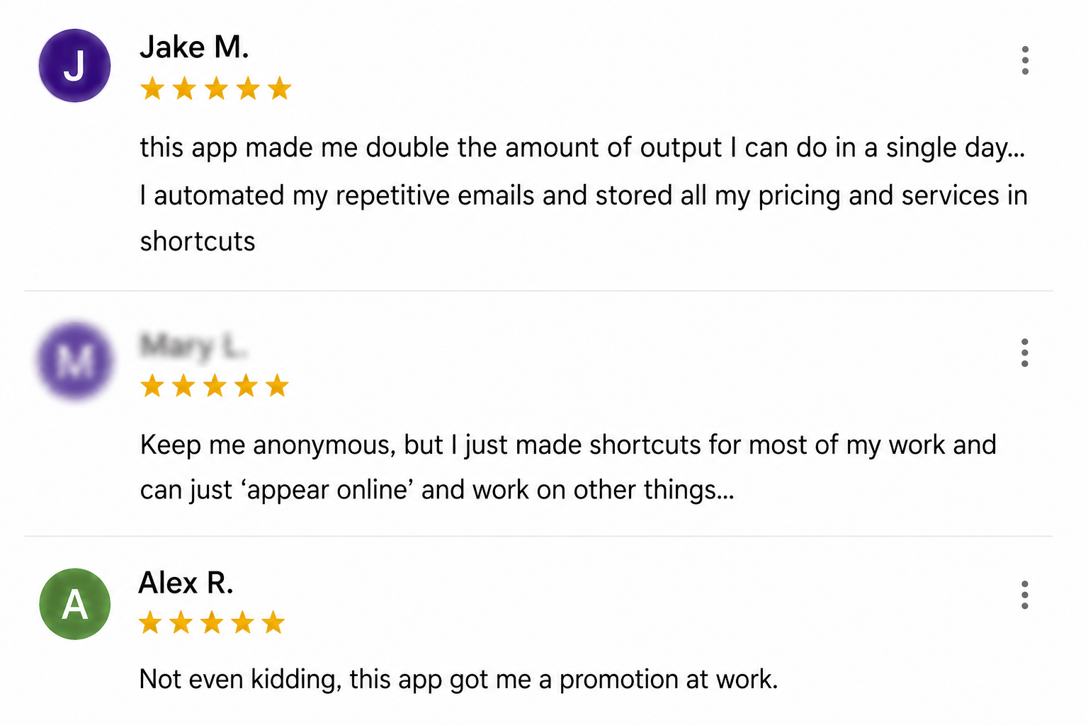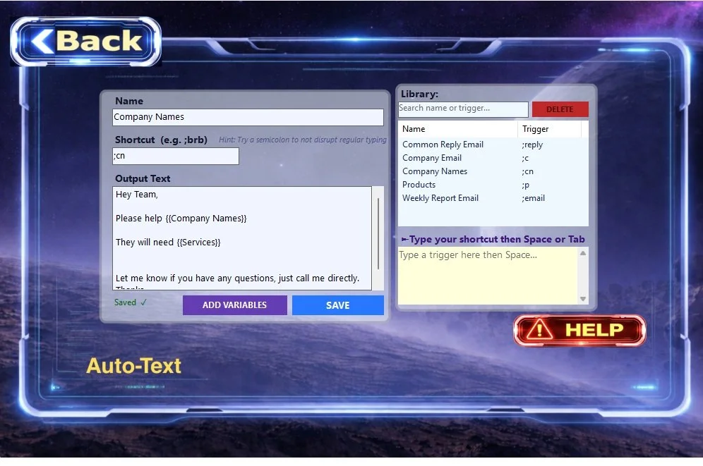 Insert frequently used text with a simple shortcut. Perfect for emails, product info storage, templates, forms, and repetitive responses. Add variables to include custom inputs, today/custom date or dropdown options with independent text.